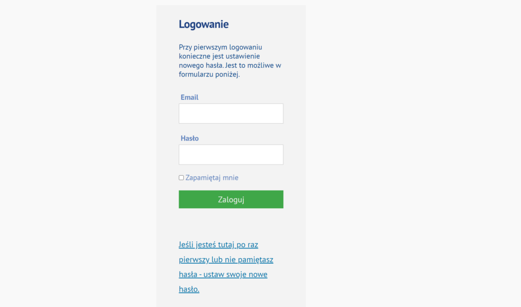 Jeśli hasło nie działa, albo jesteś tu po raz pierwszy, hasło należy zresetować linkiem znajdującym się poniżej przycisku ‚Zaloguj’.