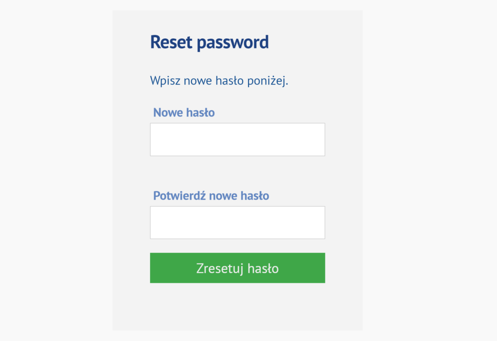 Po kliknięciu na link otrzymany w wiadomości e-mail możesz ustawić nowe hasło. Zostaniesz poproszony o ustawienie hasła, które zawiera przynajmniej jedną wielką literę, jedną cyfrę i znak specjalny. Następnie zatwierdź nowe hasło przyciskiem ‚Resetuj hasło’.