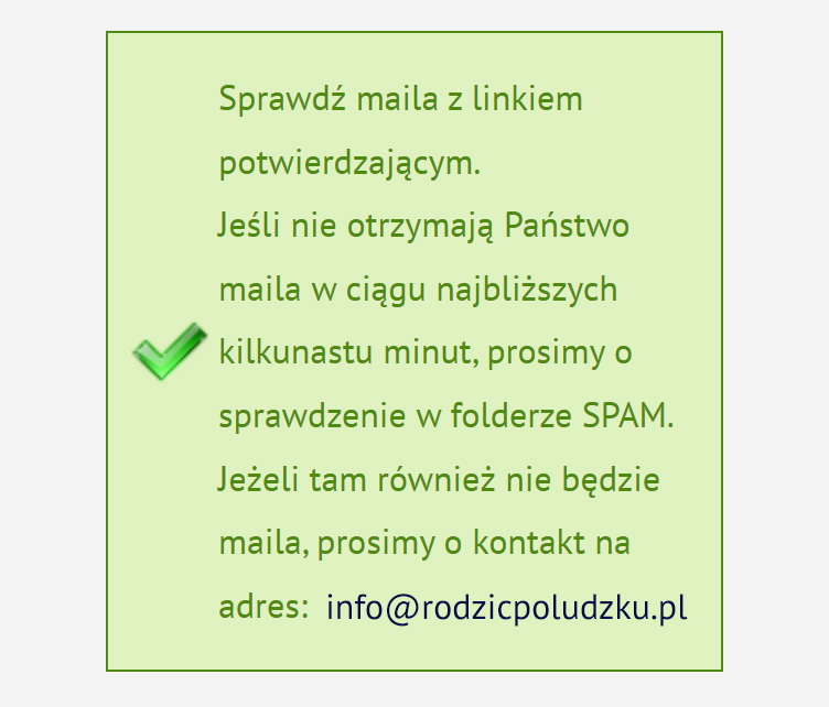Jeśli otrzymasz poniższe powiadomienie, oznacza to, że wpisujesz niepoprawny adres e-mail – skontaktuj się z Fundacją pod adresem e-mail – monika.piekarek@rodzicpoludzku.pl